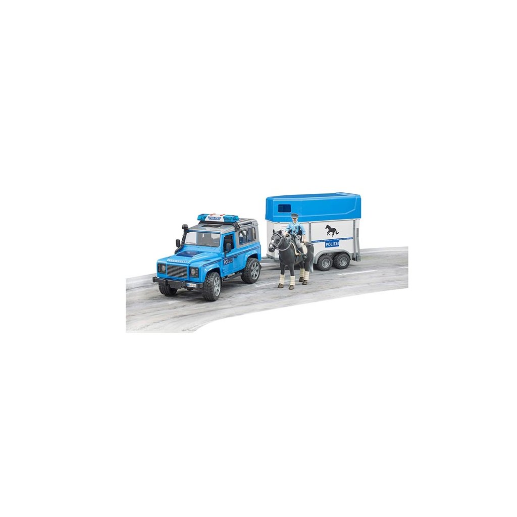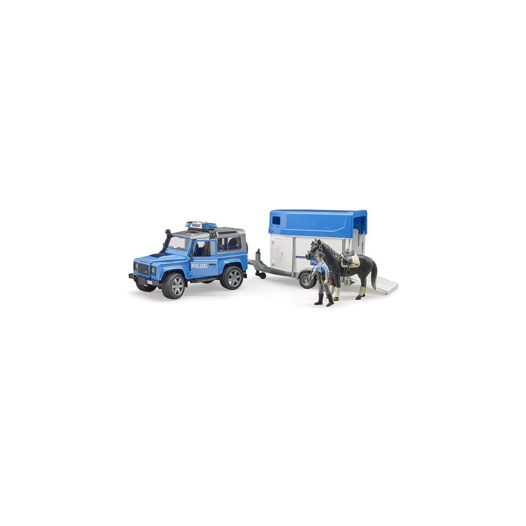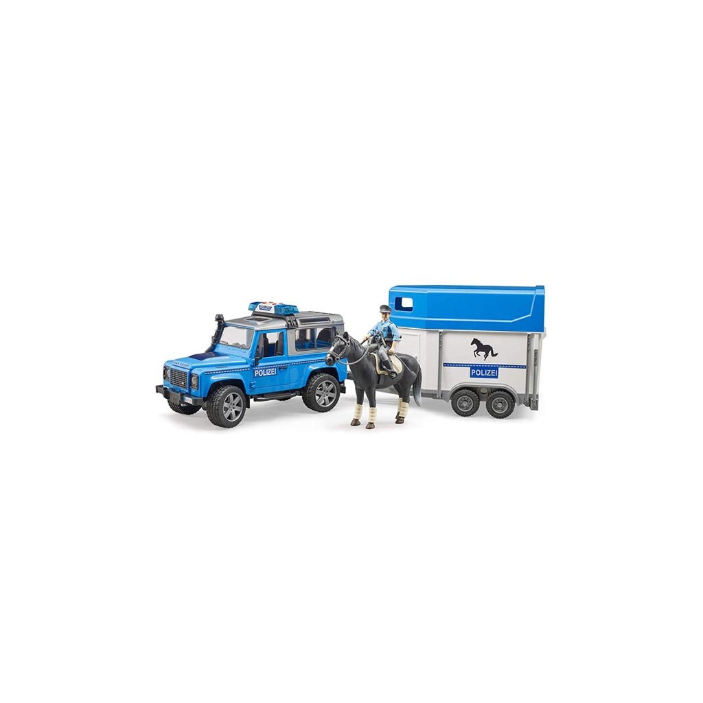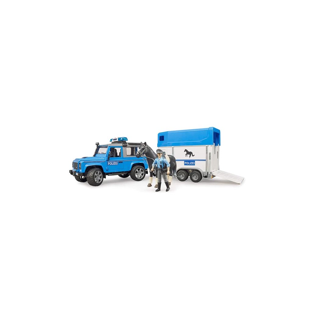 Policejní Land Rover s přívěsem, koněm a policistou - Bruder 2588K zajištění pořádku je tu speciální policejní sada Bruder.