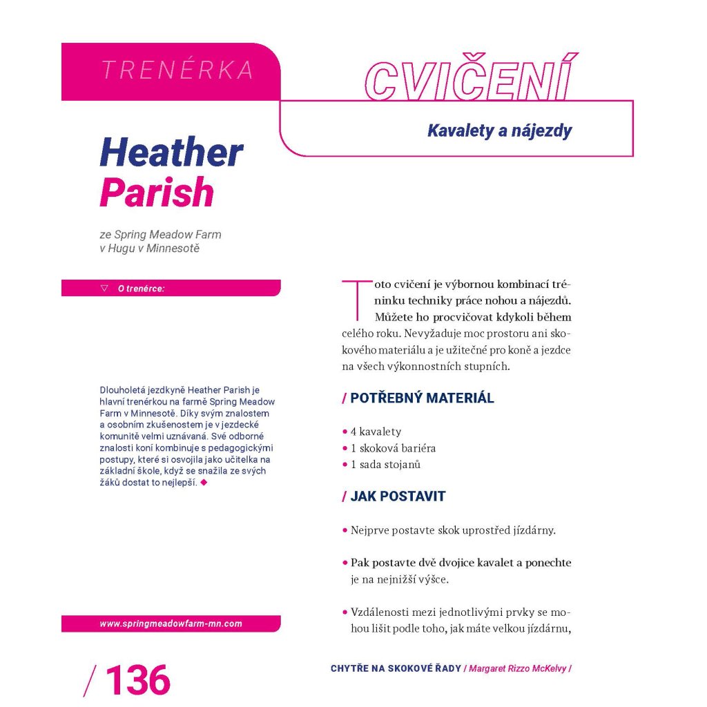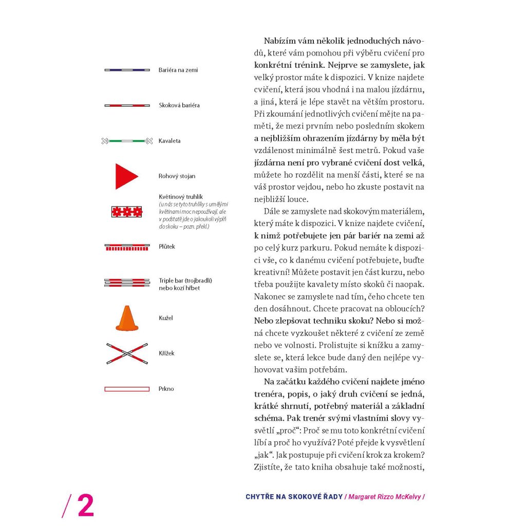 formát: 178 x 216 mm 52 superúčinných skokových cvičení od nejlepších světových jezdců a trenérů Margaret Rizzo McKelvy sestavila jedinečnou sbírku 52 kavaletových i skokových cvičení, a to nejen pro parkur, ale i pro všestrannost (se začleněním překážek, specifických pro military) s využitím zkušeností pozoruhodné skupiny špičkových jezdců, které nikde jinde pohromadě v jedné příručce nenajdete. Budujte své dovednosti a sebevědomí i kondici svého koně prostřednictvím fantastického výběru lekcí, které můžete využít ke zpestření vašeho tréninku, doladění připravenosti vašeho koně před závody i k vyřešení konkrétních výcvikových potíží. Kniha obsahuje přehledné nákresy a jasná vysvětlení, díky nimž můžete řady snadno postavit a trénovat i doma. Najdete zde cvičení, která snadno upravíte na menší i větší kolbiště, a také tipy, jak cvičení přizpůsobit vašim potřebám, aby odpovídala úrovni zkušeností vašich jezdců a koní.