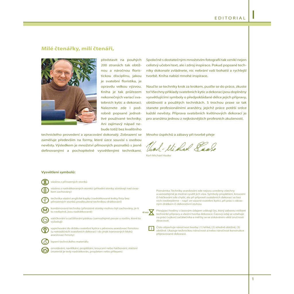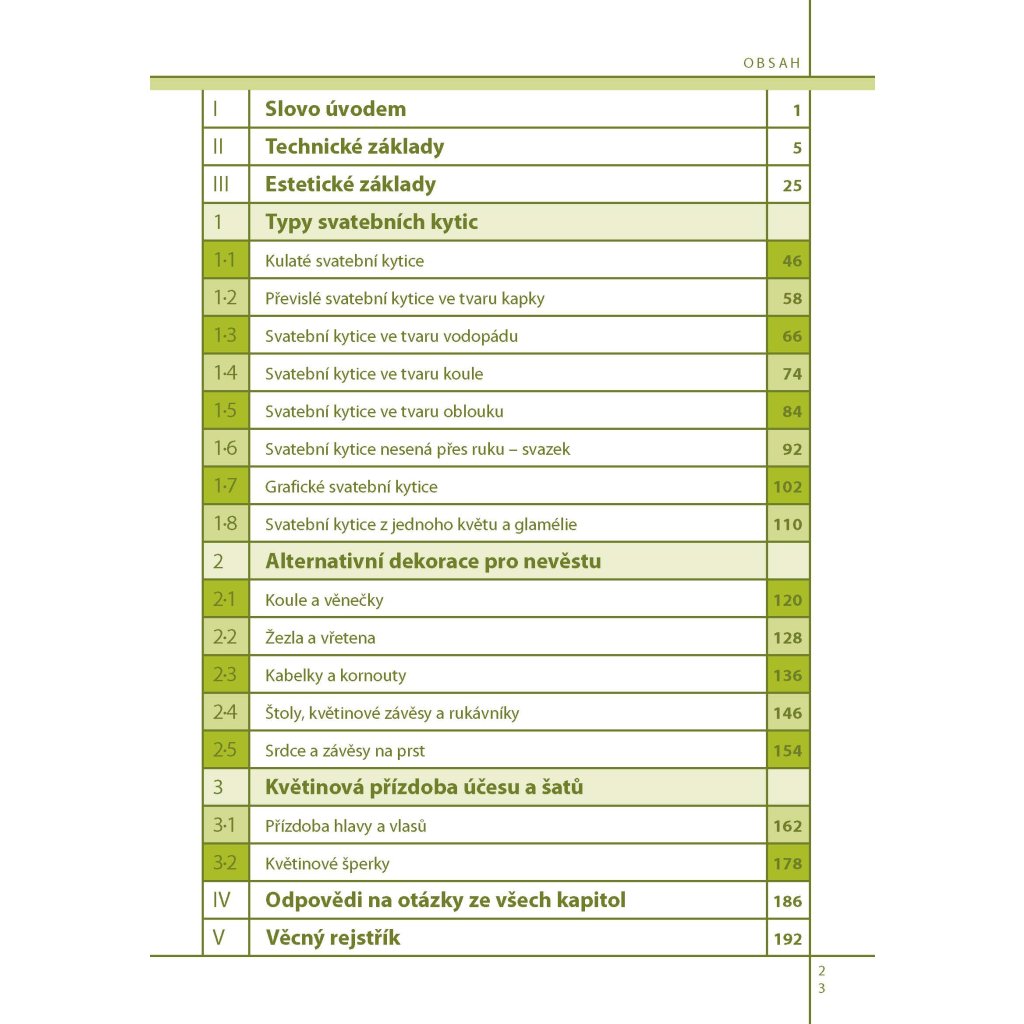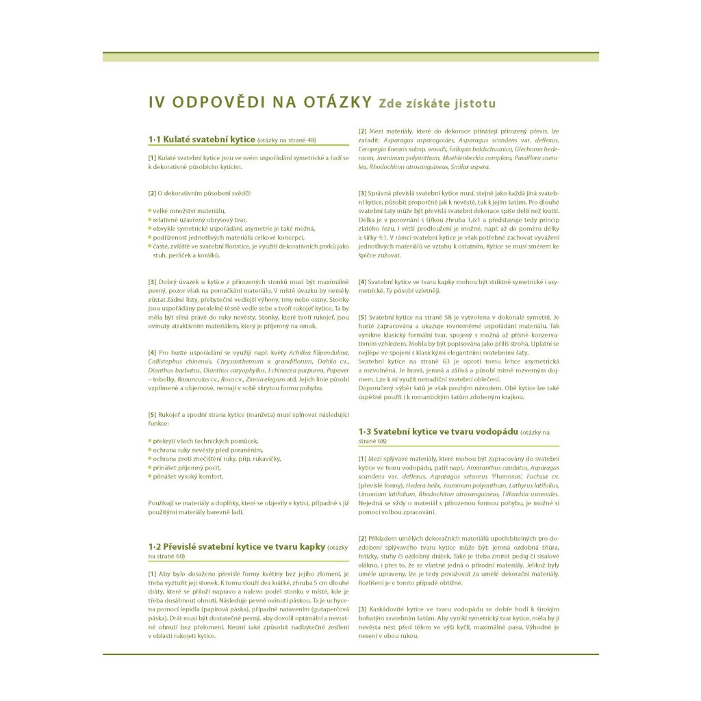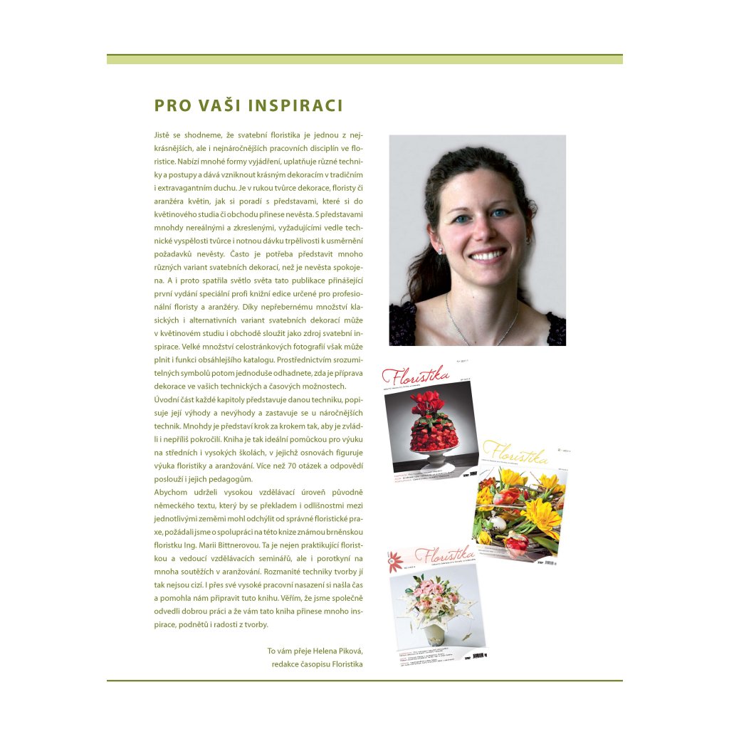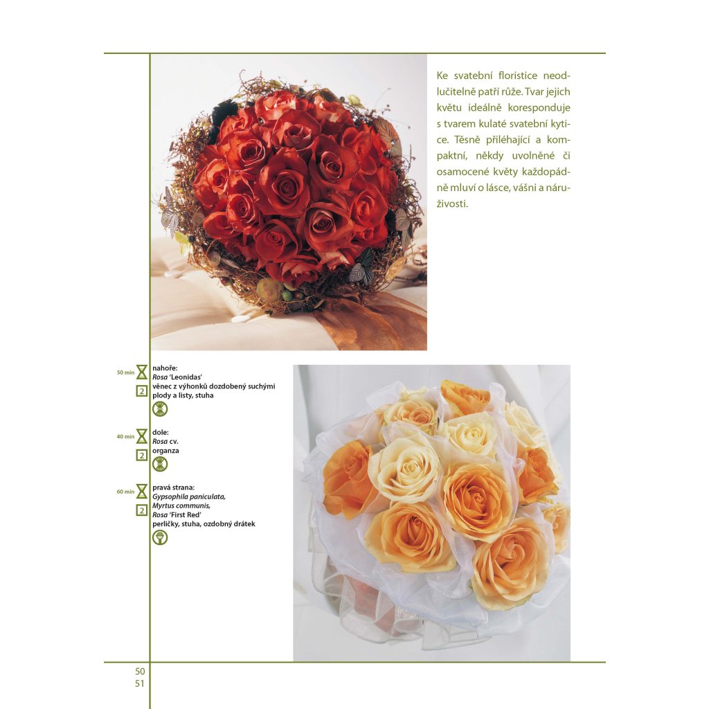 Kniha je průřezem nekonečných variací svatebních kytic a dekorací. Naleznete zde podrobně popsány jednotlivé používané techniky, množství fotografií, inspirace. Všechny ukázky jsou doplněny symboly obtížnosti, délky přípravy i použitých technik. Kniha je nejen skvělou pomůckou pro výuku na školách, ale i inspirací pro pokročilé floristy. Pusťte se do práce a s trochou praxe se stanete profesionálními aranžéry, jejichž práce potěší srdce každé nevěsty.