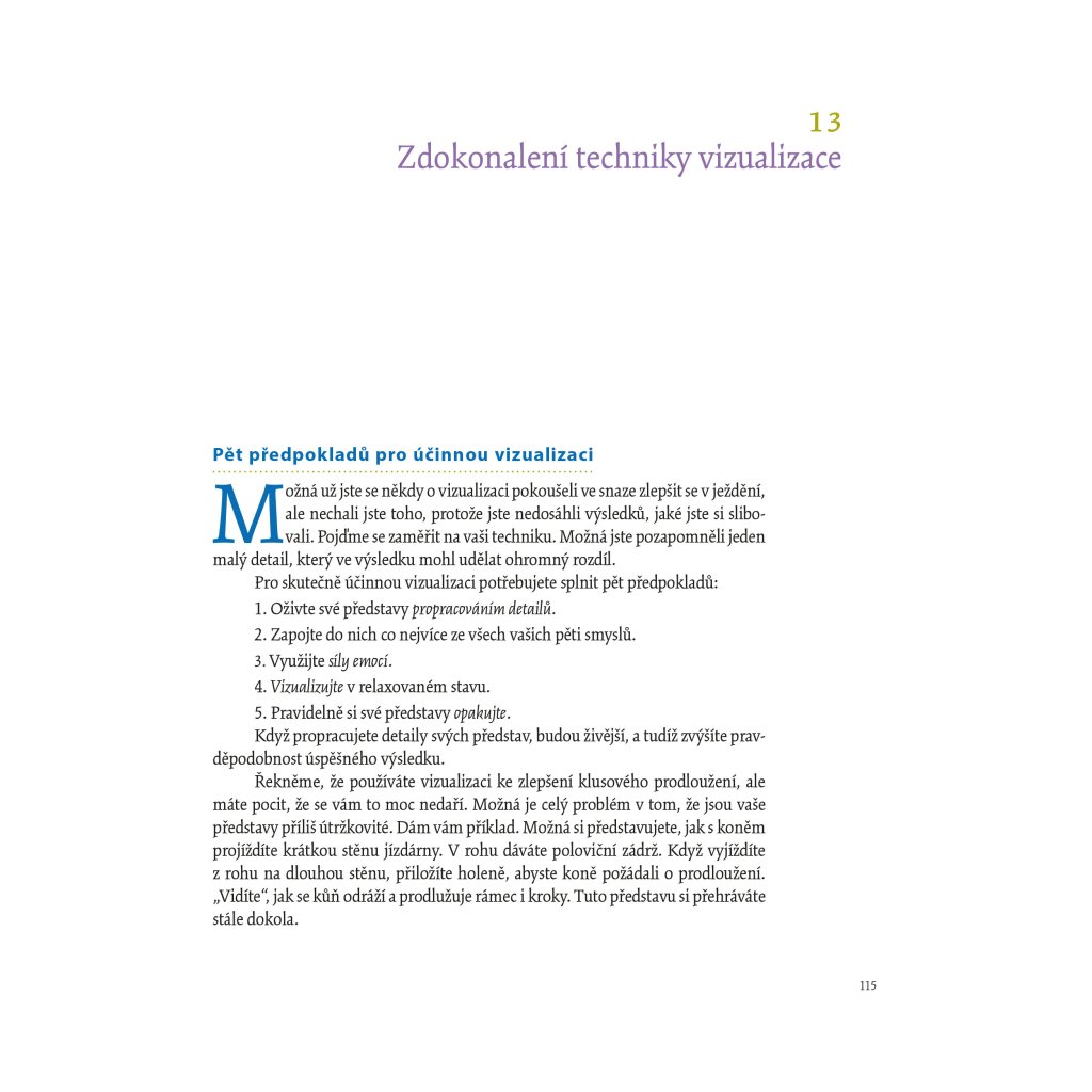 Kniha obsahuje nepřeberné množství nápadů, které vám pomohou vypořádat se s vašimi „mentálními strašáky“. Najdete v ní tipy, jak si udržet motivaci, ukotvit pozitivní emoce, cenzurovat svou mluvu, řídit své dominantní myšlenky, přeprogramovat si svůj „mentální počítač“ pomocí vizualizace a vnitřní řeči, vyrovnat se se strachem nebo jak změnit svůj přístup – a to je jen několik příkladů z mnoha. Kniha také rozebírá jedenáct různých vlastností, které jezdcům brání v tom, aby si svůj sport (ale i život) plně užívali. Jedná se o vlastnosti, jako je nejistota, frustrace, netrpělivost, napětí, pochybnosti, arogance, náladovost a pesimismus.