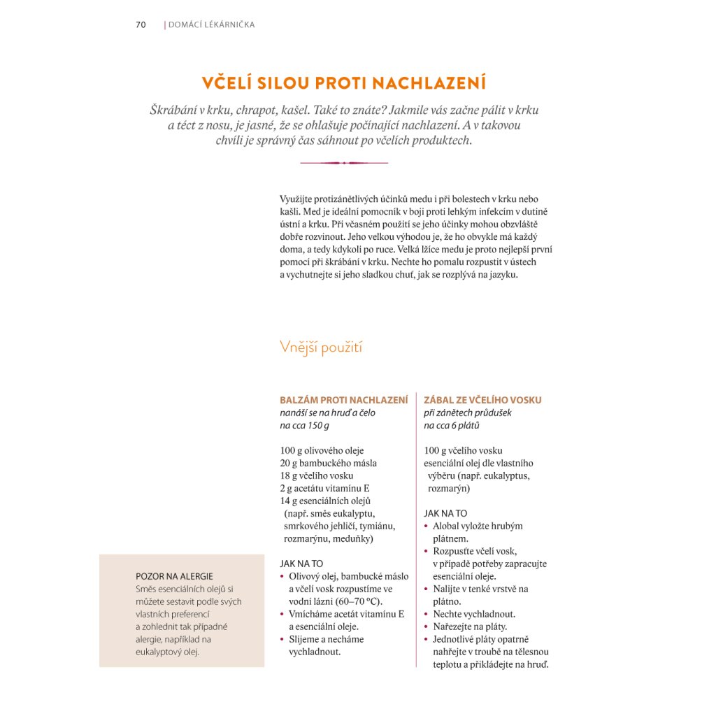 měkká vazba, rozměr: 170 x 235 mm Med, pyl a propolis 80 praktických receptů na přírodní kosmetiku, do domácí lékárničky i pro mlsné jazýčky. Autorka, vášnivá včelařka Dr. Annette Schroeder, představuje více než 80 originálních receptů, které využívají med, pyl, propolis, mateří kašičku a včelí vosk. Tyto recepty nejenže slouží pro kosmetiku a péči o tělo, ale také léčí běžné zdravotní potíže. Knize dominují návody na výrobu krémů, sprchových gelů, šamponů, mýdel, koupelí a dalších produktů pro krásu péče o tělo. Dále přináší recepty pro domácí lékárničku, která řeší například kožní potíže, rány, nachlazení, opary a problémy se spánkem. Nakonec se věnuje lahodným dobrotám z kuchyně, které zahrnují vydatné pokrmy, sladké dezerty i nápoje s medem. Začněte svou cestu k zdraví, pohodlí a štěstí s touto inspirativní knihou.