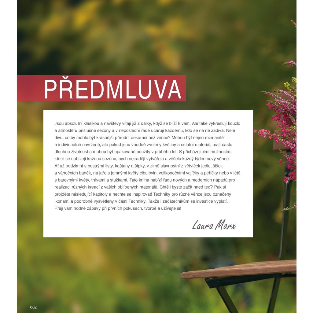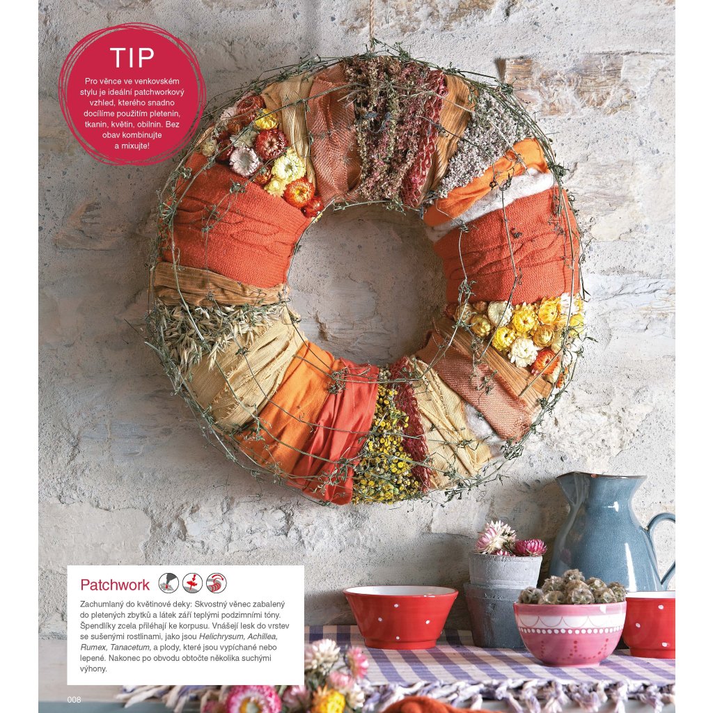 Věnec symbolizuje koloběh života, pospolitost a bezpečí rodinného kruhu, je součástí tradic, součástí oslav, radosti i naděje. Kniha nabízí mnoho nových a moderních nápadů pro realizaci různých kreací z rozličných materiálů, které najdete i v přírodě a na zahradě. Publikace je rozdělena tematicky dle ročních období. Detailní popisy technik jsou doplněny spoustou fotografií.
